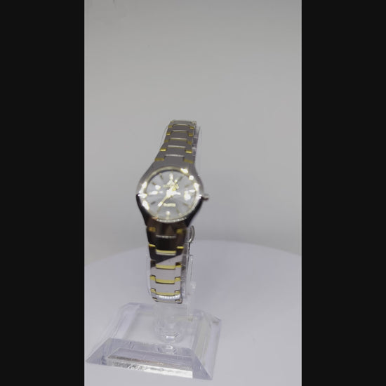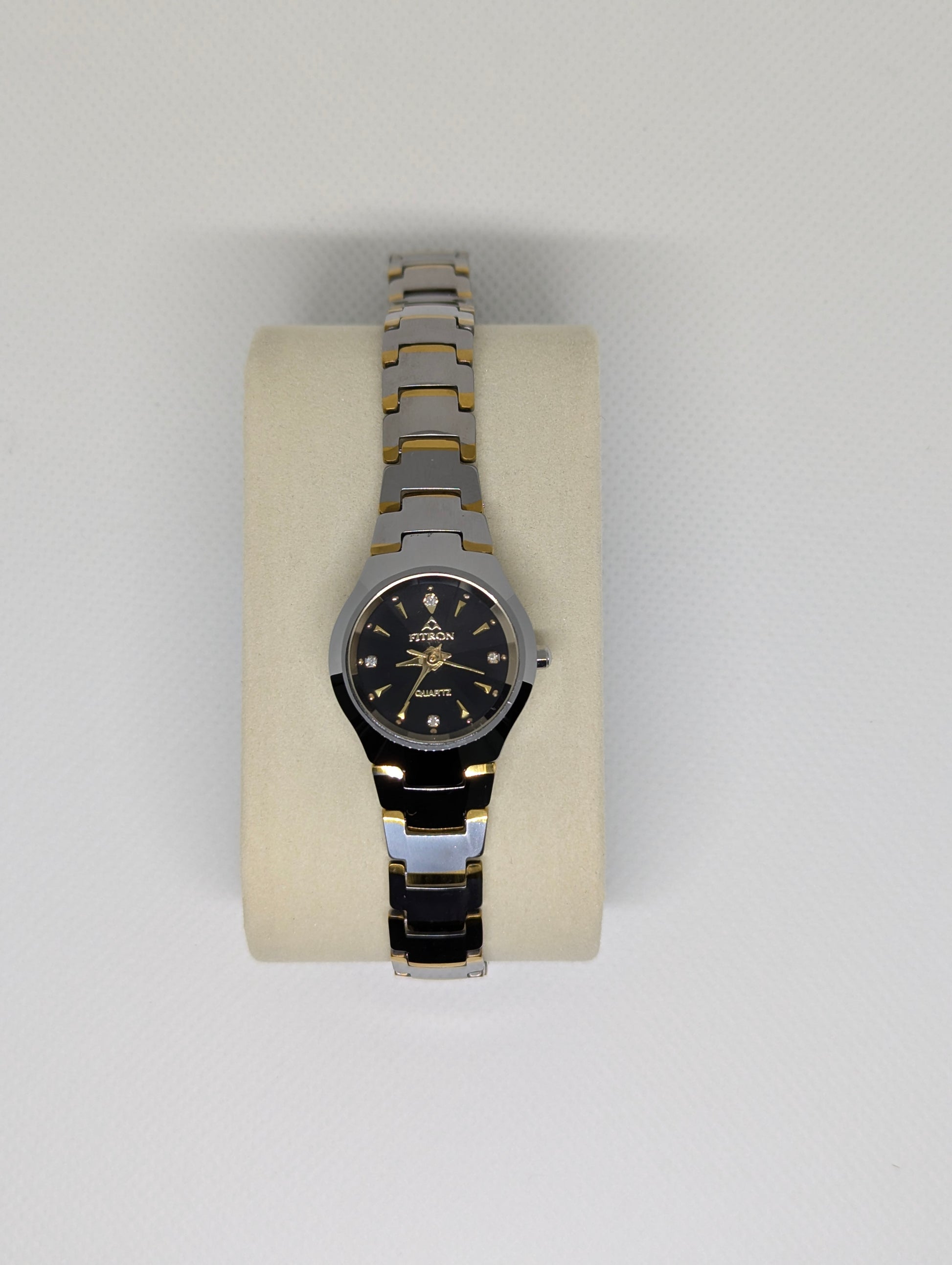 Fitron Quartz Two Tone Ladies Watch with Black Dial & Crystal Markers