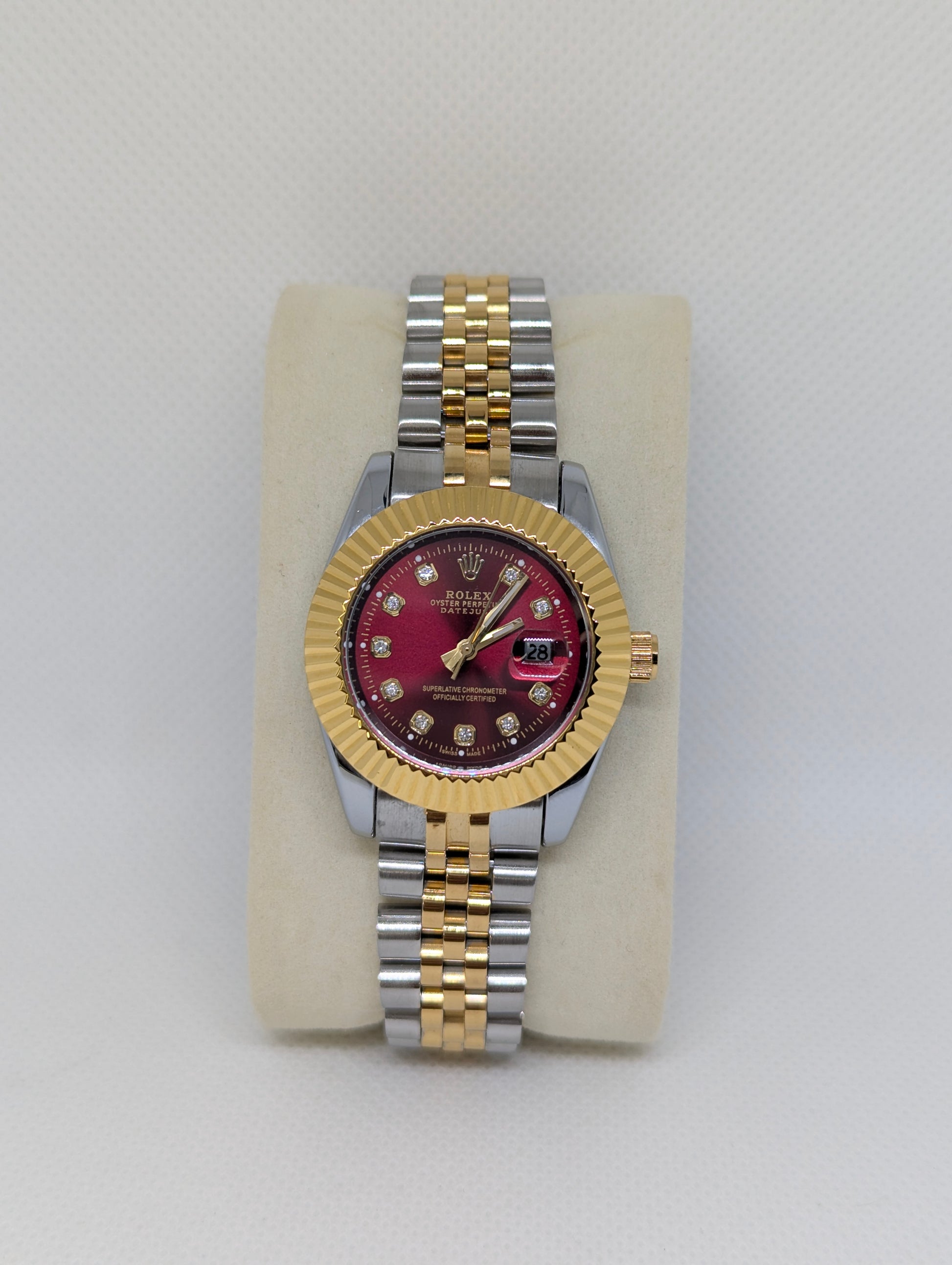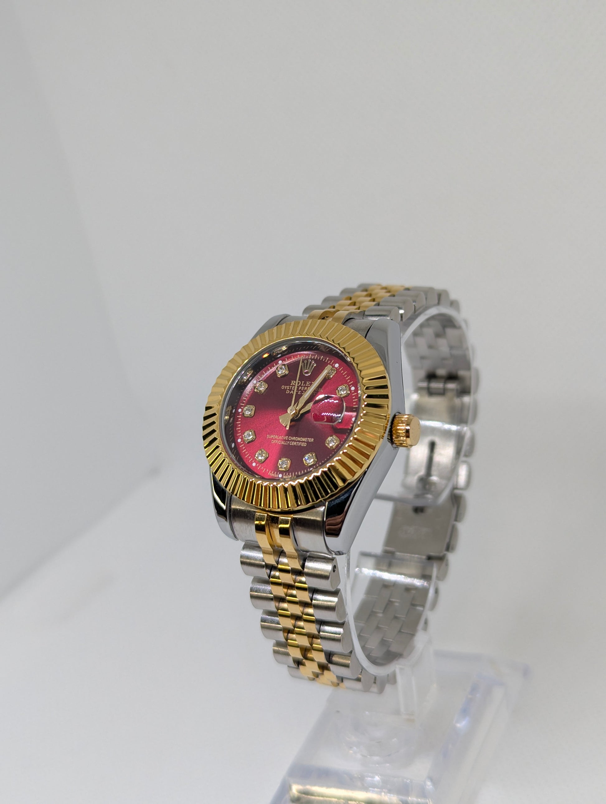 Ladies Two Tone Watch, Red Dial with Sparkling Stone Markers