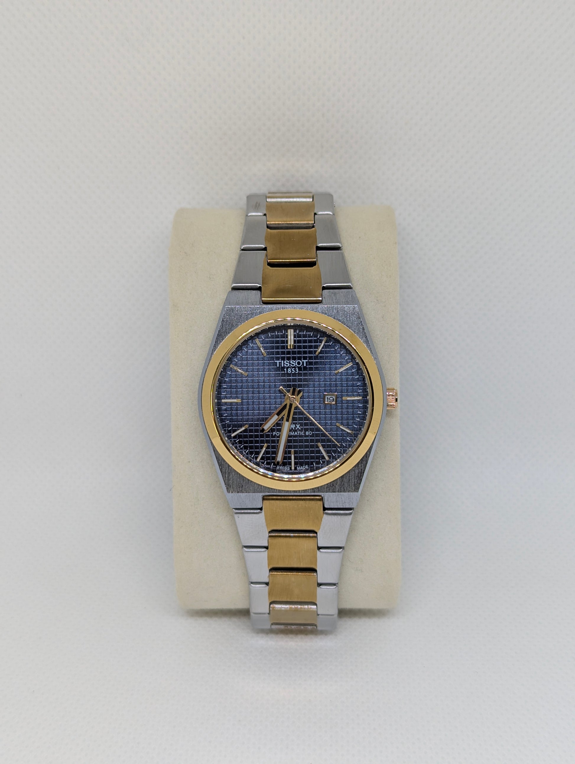 Ladies Two Tone, Blue Textured Dial, Gold Bezel Integrated Bracelet